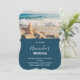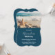 Convite de aniversário com uma foto panorâmica. Uma grande estrela-do-mar ereta em uma praia arenosa. Um belo mar azul com ondas de espuma branca ao fundo.