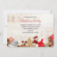 Um convite de festa de Natal com uma fotografia rústica. Madeira castanha clara com vários elementos de Natal ao longo da parte inferior. Presentes de Natal, estrela, rena, enfeites e algumas frutas da época.