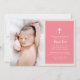 O Elegante Cross-Pink Photo Baptism Christening Invitation apresenta uma cruz doce e delicada em fundo cor-de-rosa com o tipo tradicional e uma foto.