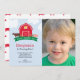 Um convite de festas divertido e fazenda com uma ilustração doce de um celeiro vermelho, com animais de celeiro, bem como a fotografia do aniversariante. Personalize com os detalhes do seu participante. O verso apresenta um padrão simples com as mesmas silhuetas de vaca, galinha e porco encontradas na ilustração da frente.