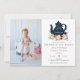 Convite de aniversário com bule azul marinho e flores. Personalize com sua foto. Personalize com suas informações ou clique em "clique para personalizar mais" para ajustar o tipo de fonte, o tamanho e a cor.