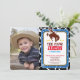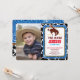 Olá! Celebre sua Festa de aniversário com nosso Convite de festas do Cowboy. Este convite de festas ocidental apresenta um vaqueiro rodeio no seu cavalo, um padrão de cochicho e um padrão paisley azul. Personalize estes convites de aniversário com a fotografia do seu filho. Um convites de festas de rodeio perfeito para seu filho festa de aniversário oeste selvagem, convites para chuveiros de bebês ocidentais ou usá-los como convites para rodeios de cowboy
