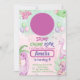 Convite de aniversário de uma garota de dinossauro bonita. As cores são cor-de-rosa, verde-menta, lavanda muito pastel.