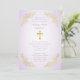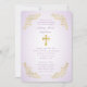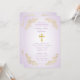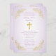 Convite de batismo roxo com pergaminho floral de ouro e detalhes cruzados. Torne este marco memorável adicionando um retrato na abertura de fotos incluída no verso. A camada de texto na parte traseira pode ser removida e substituída por seu texto personalizado. Solicite em papel de shimmer pérola os resultados mais opulentos.