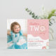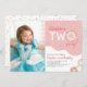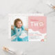 Este convite de aniversário rosa fofo foi projetado para uma garota fazendo 2 anos. O texto moderno diz "(Nome) é DOIS doces", acentuado com e rosquinha fosco com borrifagens e oferece uma foto vertical. Fotografia © Storytree Studios, Stanford, CA