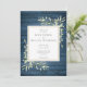 Com destaque para folhagens em aquarela sobre um fundo de madeira rústica azul, este convite de casamento botânico elegante pode ser personalizado com sua foto e informações especiais do dia do casamento. Criado por Thisisnotme©