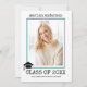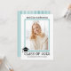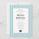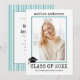 Convite de foto de formatura em máquina de escrever com listras azuis turquesa da turma de 2023. O verso inclui um padrão turquesa e branco com listras.