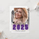 Anúncio de Formatura Clássico Moderno e Convite para Festa. A frente apresenta uma foto de página inteira com um gradiente branco na parte inferior que se funde perfeitamente na imagem. Sobre o gradiente, o ano aparece em uma fonte clássica escolar em negrito roxo. Logo acima, "Turma de" é escrito em uma elegante letra cursiva preta, de modo que fique 'Turma de 2026' ou qualquer ano. À esquerda do ano, há um pequeno ícone de boina de formatura personalizável, que você pode alterar para combinar com sua paleta de cores. Abaixo do ano, o nome do formando e o nome da escola são exibidos de forma destacada. Todas as cores podem ser personalizadas para combinar com as cores da escola ou preferências pessoais.