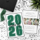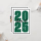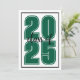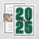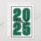 Convite de formatura vertical atemporal e convite de festa. A frente apresenta o ano "2025" em fonte grande e negrito, com "turma de" escrito de forma elegante em letra cursiva no meio. Esta versão apresenta uma paleta de cores clássica em verde, preto e branco, mas todas as cores - incluindo o ano, texto em letra cursiva e moldura - podem ser personalizadas para combinar com as cores da escola ou preferências pessoais. A cor do fundo também pode ser ajustada para um toque personalizado.