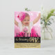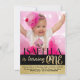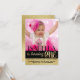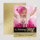 Convite de primeiro aniversário preto e dourado com listras de folha de alumínio pretas e douradas e texto sobre um fundo de foto completa e verso com folha dourada. Você pode personalizar facilmente este convite de primeiro aniversário preto e dourado adicionando sua foto e detalhes do evento. Você pode alterar o estilo e a cor da fonte e mover o texto conforme necessário para sua foto. Este é um design impresso sem folha de alumínio real. Você pode remover o dourado do fundo para adicionar uma cor ao fundo.