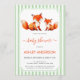 The text is in a pale green frame on a pale green stripes background. In the upper part of the frame, above the text, there are 2 cute red foxes, the bigger mama fox and the smaller baby fox pup, painted in watercolor. Under them there is the text: the words "baby shower" and are written in a red handwriting script, the name in red caps, the date / time in black caps, the rest in smaller black caps. On the background behind the frame and on the back, there are only pale green and white stripes.
