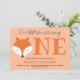 Um primeiro convite de aniversário para bebês que diz "Nossa raposa está virando uma". Este convite é laranja e marrom com a palavra "Um" em letras grandes, com uma ilustração do rosto da raposa como primeira letra da palavra. Simplesmente, personalize este convite, adicione-o ao seu carrinho e feliz aniversário ao seu maravilhoso bebê! Fox Transformando Um Primeiro Aniversário Convocando Design de Feriado | ©Melissa Patton — Artista/Ilustrator