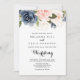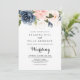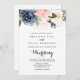 Este elegante convite floral de inverno de ouro e de volta para o casamento é perfeito para um casamento simples. O design apresenta belas flores azuis escuras, azuis, marinhos, rosa, pinceladas, douradas e folhagem verde pintadas manualmente, amontoadas em buquês elegantes. Salve o papel, incluindo mais detalhes na parte traseira do convite em vez de em uma placa de gabinete separada.