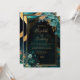 Um elegante quadro azul lacrimogêneo e aquoso dourado, decorado com flores lacrimogêneas e douradas, fornece a definição do texto dourado sobre um fundo retangular e escuro. O verso oferece espaço para detalhes do casamento, juntamente com um código QR que os convidados podem digitalizar para visitar seu site e RSVP, o que economiza o custo de impressão e envio de cartões RSVP separados.