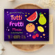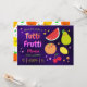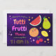 Incomode seus convidados com este convite de festas colorido com frutas bonitinhas e tipografia vibrante sobre fundo roxo. Basta adicionar os detalhes do seu evento neste modelo fácil de usar para torná-lo um convite de tipo único. Sacudir a placa por cima para revelar um padrão fruta colorido na parte traseira da placa.