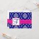 Cartões de Save the Date com padrão damasco azul e cinza prateado, monograma e nomes com destaques em rosa fúcsia. Design do convite por Elke Clarke ©2009. Gráficos licenciados para uso. Personalize com seu monograma, nomes e informações do anúncio de casamento. Além disso, escolha entre uma variedade de fontes e papéis lindos para tornar seus cartões de save the date FABULOSOS! Em seguida, use o mesmo design para seus convites de casamento. Entre em contato conosco para alterações nas cores.