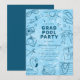 Make a splash with this fun pool party graduation invitation! Featuring a vibrant blue background and playful hand-drawn doodles, this design includes all the perfect summer and graduation elements—an inflatable flamingo, grad cap, swimwear, ice lolly, books, flip flops, swim bag, and sunshine.