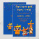 A fun Fiesta Retirement Party Invitation to celebrate someone special on their Retirement, designed with Mariachi band caricatures playing their instruments, dressed in vibrant orange and yellow on a blue background. The front text includes: Retirement Party Time!, Join Us As We Honor, The First and Last Name, The Date and Time, The Location and Address. The reverse text includes: Reply and your Contact Details. To personalize, simply insert your event details into our easy template, replacing the sample text. This invitation is available in both Print and Download.