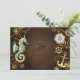 Fundo de madeira castanho com fundo marinho, cordilheira mecânica, volante antigo, âncora de ouro e diversas engrenagens de ouro e latão. Estilo Steampunk.