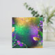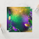 Fundo de grãos de cereais, iridescentes, textualmente, com manchas roxas, amarelas e verdes, decoradas com penas e miçangas brilhantes. feriado Mardi Gras.