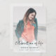 Um convite para o funeral de fotos moderno e minimalista para comemorar a vida do seu ente querido num estilo minimalista e simples de design, com uma letra manuscrita e um fundo de cinza de pomba suave. O convite pode ser facilmente personalizado com sua própria foto e texto para criar um tributo especial para o funeral, memorial ou celebração da vida de seu ente querido. A imagem mostrada é apenas para fins de ilustração para ser substituída pela sua própria foto. A imagem mostra uma jovem de cabelo comprido marrom e comprido vestindo uma jaqueta de couro, jeans laranja e topo branco. #funeral #convite