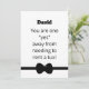This funny usher card features the words, "You are one "yes" away from needing to rent a tux" on the front. You can customize the name of your potential usher above the words. Below the words you will find a bowtie. On the back side of the card, are the words, "Will you be my usher?" You can even customize your name. Copyright Kathy Henis