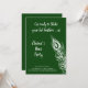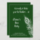 Uma grande pena de pavão decora este convite de Galinhas à Beira de um Ataque de Nervos em um fundo esmeralda verde com a frase fofa, Prepare-se para Sacudir as Suas Penas! tornando-o perfeito para uma noite na cidade dançando para celebrar a noiva.