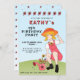 Menina de jardinagem bonita com convite de aniversário de flores. Um desenho de uma garota com flores em uma lata de água e girassóis. Na parte de trás está um padrão de girassol. Adicione seu texto e faça um convite de aniversário divertido para a garota.