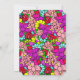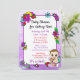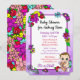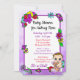 Convites de chuveiro de menina de templo roxo. Bonito garotinha branca e floral segurando um ursinho rodeado por flores bonito brilhantemente coloridas. O dorso é uma malha colorida de flores do estilo folk-art brancas em vermelho, roxo, rosa, azul, lacrimejo e amarelo.