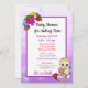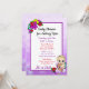 Convites de chuveiro de menina de templo roxo. Bonito garotinha branca e floral segurando um ursinho rodeado por flores bonito brilhantemente coloridas.