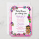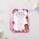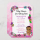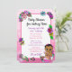 Convites de chá de bebê de menina rosa e roxa. Bonito garotinha branca e floral segurando um ursinho rodeado por flores bonito brilhantemente coloridas. Este doce bebê foi desenhado com pele mais escura para representar bebês afro-americanos, biraciais ou hispânicos.