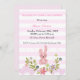 Convite para chá de fraldas, cor-de-rosa, editável, design com coelho, flores, listras brancas e cor-de-rosa e balões.