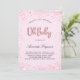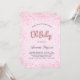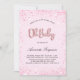 Para um chá de fraldas, comemorando um menino. Uma rosa claro, fundo cor-de-rosa. Decorado com pó de brilho falso. Personalize e adicione o nome da mãe e os detalhes da festa. Oh Bebê é escrito com um script/fonte estilo balão.