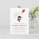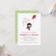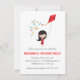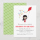 convite de festas de aniversário bonito para festas de meninas, com uma menina de desenho em um vestido vermelho segurando uma pipa com arcos coloridos. No verso há um padrão de faixas verdes, diagonais. Design e ilustração do MheaDesign. Para obter mais informações sobre a imagem ou o design impresso, entre em contato comigo através da minha página no Facebook:https://www.facebook.com/MheaDesign