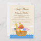 Comece seu chá de fraldas de menina ou chá de fraldas de garoto com nosso super bonito convite para chá de fraldas de Arca Noahs. O convite apresenta uma arca com um tigre, girafa, leão, elefante, zebra e macaco navegando num oceano cheio de peixes. Visite nosso compro para uma grande seleção de convites para o chá de bebê, bonitos, modernos e modernos. ©Mujka Chic