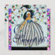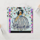 Vibrante, clássico, design artístico de Arte Arte, linda jovem com chapéu preto e lindo vestido branco listrado, arco e boletins coloridos e decorativos.