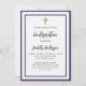 Um convite moderno, elegante e de confirmação. Um fundo branco decorado com quadros azuis marinhos e uma cruz ouro. Personalize e adicione um nome e detalhes. Letras pretas coloridas.
