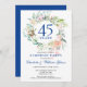 Com uma delicada guirlanda de verde floral em aquarela, este convite de aniversário de casamento surpresa botânico chique para 45 ou 65 anos pode ser personalizado com as informações do seu aniversário de casamento de safira. O verso apresenta uma guirlanda floral correspondente emoldurando as datas de aniversário em texto branco elegante em um fundo azul safira. Concebido por Thisisnotme©