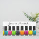 O design colorido e na moda apresenta garrafas brilhantes de cor esmalte cor-de-rosa, roxo, verde, laranja, amarelo, azul e verde. O perfeito elogio ao seu negócio de salão de unhas. Personalize o texto para ajustado das suas necessidades.