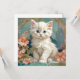 Cartão com um gato branco no estilo de Alphonse Mucha! Este gatinho fofo de olhos azuis posa com flores cor-de-rosa e cobertores azuis. Um presente fabuloso para amantes de gatos e colecionadores de Art Nouveau!