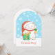 Um gato branco sorridente, com um chapéu de Natal vermelho tradicional, segurando um presente grande envolto, está desejando a todos um Natal muito feliz! Na pata esquerda, o gato está segurando um sino alto de ouro com um arco verde. Bonita e original convite de festas de Natal!
