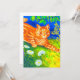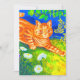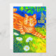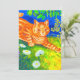 Cartão com pintura de animal de Louis Wain, Gato Espionando (1860-1939). Um gato listrado laranja caminha em um campo verde à noite. Flores brancas, roxas e vermelhas estão em primeiro plano. Um presente maravilhoso para amantes de gatos e arte inglesa.