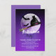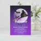 Este convite de Halloween mostra um gato negro com um chapéu de bruxa voando na noite em uma vassoura-bruxa cercada por morcegos em frente a uma lua de cheio.
