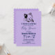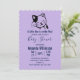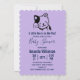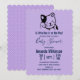 Um convite de chá de bebê projetado com uma ilustração de um gatinho sorridente e acenando com uma mancha preta ao redor da orelha. Simples, fofo e adorável. Fundo de bolinhas roxas na parte de trás.
