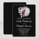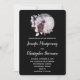 Convite de casamento com pintura em aquarela de um gato preto e um buquê floral lilás claro. De pé em frente a uma grande lua cheia. Elegante e mágico. Fundo preto.