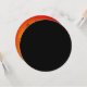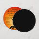 Gato preto assustador com olhos laranja na frente de uma lua laranja grande e cheia.