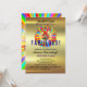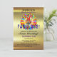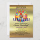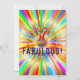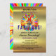 Convite de aniversário de cinquenta anos retro "50 e Fabuloso!" ou de qualquer idade, personalizável, brilhante e alegremente festivo. Com um logotipo ousado de explosão de estrelas em arco-íris na frente e nas costas e um fundo metálico dourado em relevo na frente.