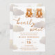 Convide seus amigos e sua família para o seu chá de fraldas com essas bonitinhas que podemos esperar um convite para chás de fraldas gêmeos. Design apresenta dois ursos peludos aquarelas, um monte de nuvens junto com uma bela caligrafia.