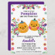 Este belo e colorido convite para chás de fraldas para gêmeos de meninos e meninas apresenta o tema Dia dos Mortos ou Dia de los Muertos que é perfeito para a celebração do Dia das Bruxas ou do outono. Duas pequenas abóboras bebê são fotografadas no centro com seu rosto pintado para se parecer com um crânio de açúcar. Elementos florais coloridos, em estilo paisley, destacam as bordas.