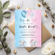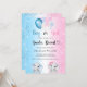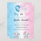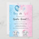 For a gender reveal baby shower. A blue white and pink gradient background. Decorated with glitter and blue, pink and white balloons and glitter dust. A baby boy elephant and a gaby girl elephant. Personalize and add the names of parents to-be and party details. The name and the text: Boy or Girl are written with a hand lettered style script